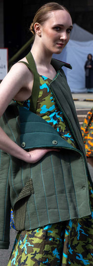 “And when our girls change their overcoats for dresses…” - in the designer’s new interpretation, front-line overcoats and tunics with shoulder straps, raincoats and breeches are replaced by feminine dresses and quilted jackets worn directly over them as “an echo of a past war.”
